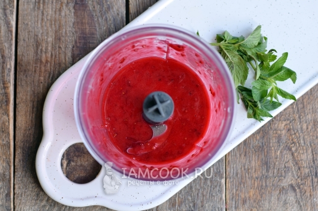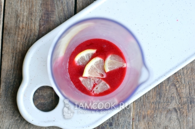 Однородную ягодную массу без семян перелейте в высокий стакан, добавьте целые дольки лимона.