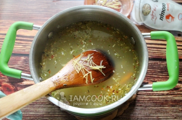 Добавьте вермишель и приправу для тушения овощей (или свою любимую). Варите минут 5 и отключите плиту. Дайте супу дойти до готовности под крышкой минут 15.