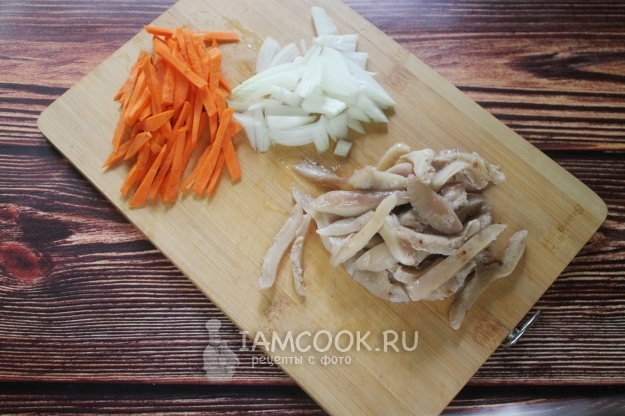 А сами в это время займитесь приготовлением суповой заправки с сыроежками. Порежьте соломкой морковь, лук и грибы (по правилам, когда-то прописанным в "Книге о здоровой пище", все нарезанные ингредиенты должны быть примерно одной формы, а мы используем вермишель, вот и постараемся соответствовать. Хотя, конечно, это - дело вашего выбора).