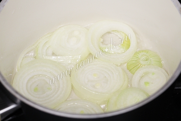 Лук нарезаем колечками и обжариваем до прозрачности на растительном масле.