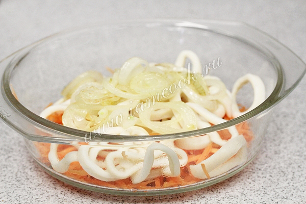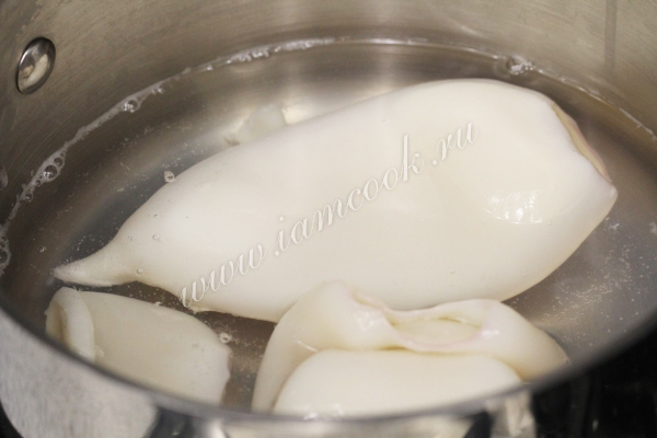 Кальмаров опускаем в кипящую воду на 3-4 минуты.