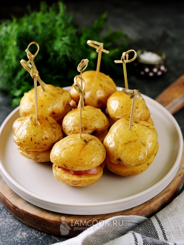 Перед подачей сложите две половинки картофеля с кусочками грудинки и со специями, скрепите их зубочисткой или бамбуковой шпажкой.