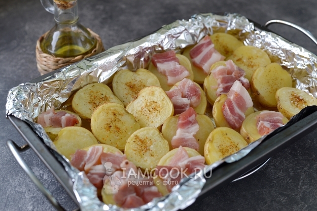 Спустя время достаньте противень из духовки, проколите пару штук. Если нож входит легко, нарежьте сыровяленую грудинку, выложите кусочки на половину картофеля, вторую половину чуть посолите и посыпьте приправой для картофеля. Отправьте в духовку еще на 10 минут.
