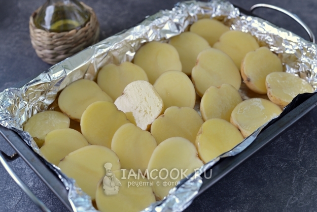 Каждую картошку разрежьте вдоль пополам, выложите в противень срезом вверх, смажьте каждую слегка постным маслом. Если будете использовать сырую грудинку, тогда нарежьте ее ломтиками и выложите на половину картофеля. Отправьте в предварительно разогретую до 180 градусов духовку в режиме полуконвекции на 30-35 минут.