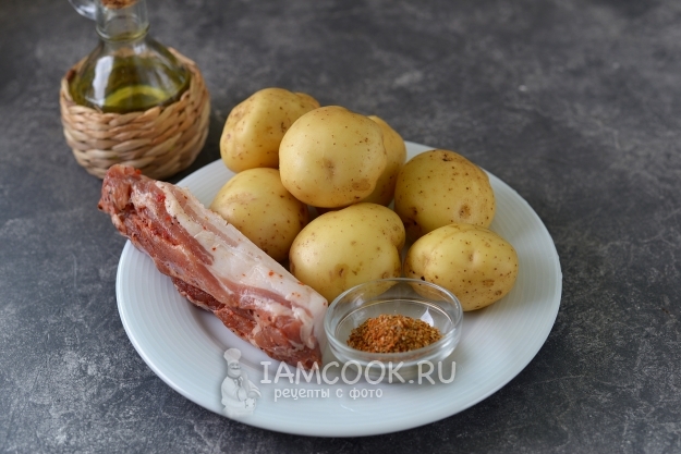 Для приготовления картошки по-деревенски с грудинкой в духовке возьмите продукты по списку. Картофель подойдет мелкого калибра. Помойте его хорошенько со щеткой под проточной водой, слегка обсушите. Грудинка у меня в этот раз базарная сыровяленая, но подойдет и сырая.