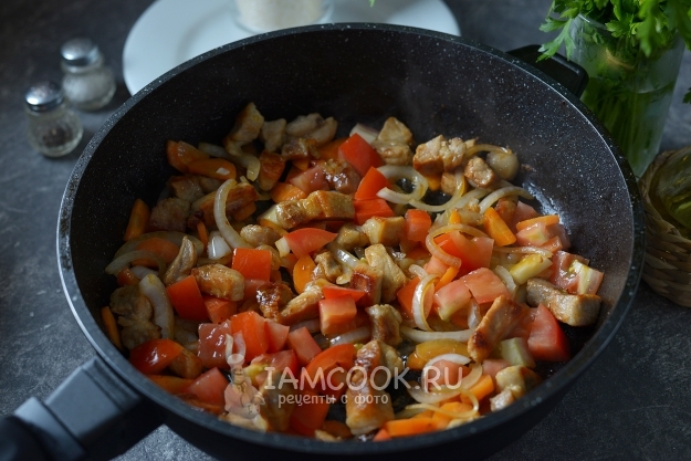 Помидор нарежьте кубиком, всыпьте в сковороду, тушите еще минуты 3.