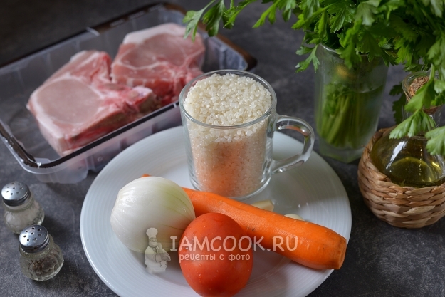 Продукты для приготовления круглого риса с мясом и овощами на сковороде подготовьте по списку. Лук, чеснок и морковь почистите, помойте вместе с мясом и зеленью под проточной водой, слегка все обсушите.