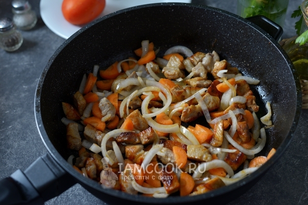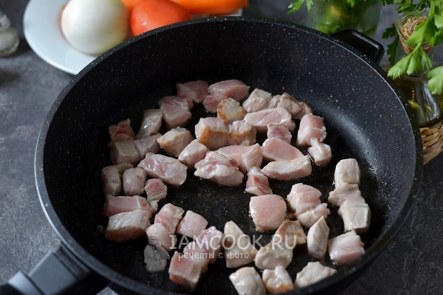 Разогрейте в сковороде немного постного рафинированного масла, обжарьте в нем нарезанную мелким кубиком свинину, дальше подливайте понемногу горячую воду и тушите мясо под крышкой на тихом огне минут 20-30, до полной готовности и мягкости.