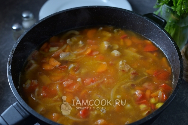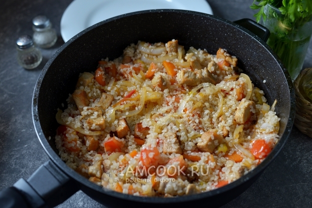 Влейте горячую воду или бульон на 1,5 сантиметра выше мяса с крупой, посолите и поперчите по вкусу, положите раздавленный чеснок. Можно по желанию добавить любимые приправы, например, зиру. Накройте сковороду крышкой, включите самый тихий огонь, готовьте до полного испарения воды и готовности риса. В зависимости от сорта это может занять от 15 до 20 минут.