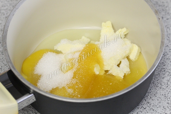 Положим в кастрюлю мед, сахар, яйцо, масло и соду.