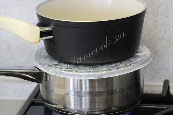 Поставим ее на водяную баню. Вот такая конструкция у меня получилась сегодня, конечно можно просто подобрать посуду разных диаметров. В нижнюю наливаем воду, а верхняя нагревается на пару.