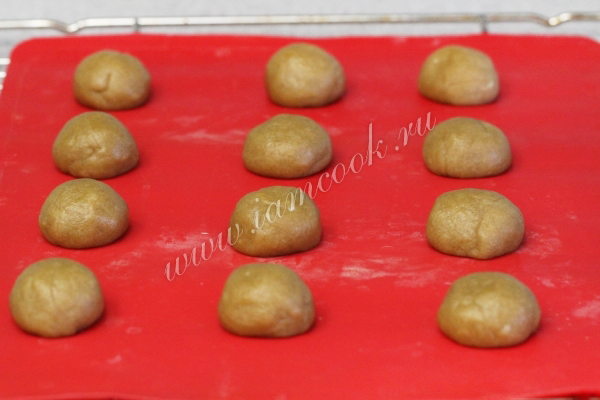 Затем разделить на равные части и скатать шарики. У меня получилось 12 маленьких шариков. Выпекать в разогретой до 180 градусов духовке 12-15 минут.