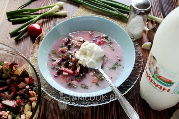 Влейте айран, размешайте. Все, наш освежающий холодный борщ на айране готов!