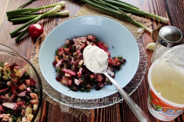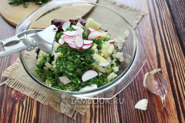 Мелко нарубите зеленый лук и укроп, ломтиками порежьте редиску. Раздавите зубчик чеснока и тоже добавьте в приготовленную смесь. Теперь основа борща готова, остается только разбавить ее по вкусу айраном и добавить сметану.