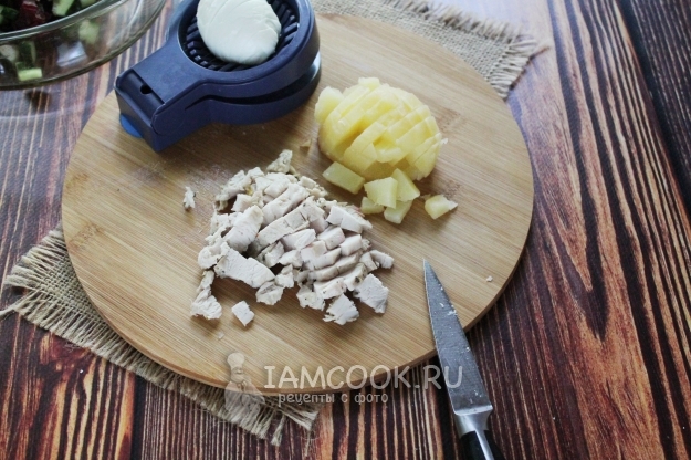 С помощью яйцерезки измельчите яйца (или обычным способом), порежьте таким же мелким кубиком вареное мясо и картошку.