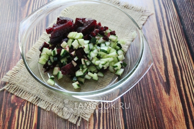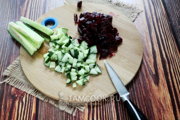Нарежьте мелким кубиком огурец и вареную свеклу.