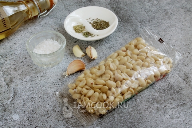 Для приготовления жареного арахиса с морской солью, чесноком и пряными травами возьмите продукты по списку.