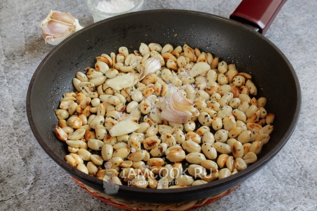 Солим, кладем несколько раздавленных зубков чеснока (их потом легко отделить от жареного арахиса). Еще разок встряхиваем и пропитываем ароматами пару минут. Снимаем с огня.
