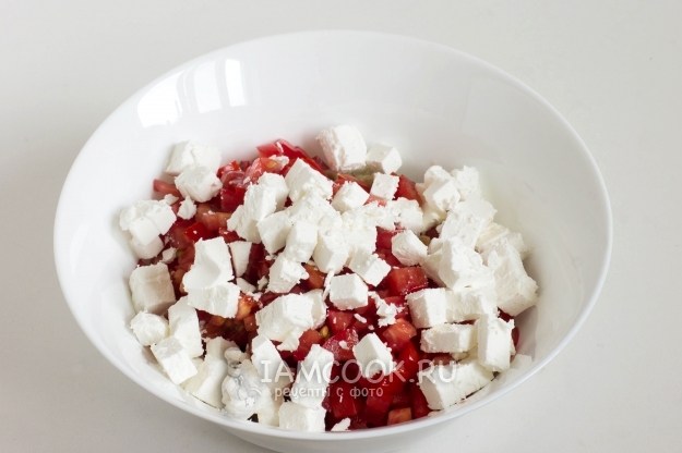 Помидоры промойте, не крупно нарежьте кубиками и добавьте в салат. Сыр Фета также нарежьте небольшими кубиками и добавьте к остальным продуктам.