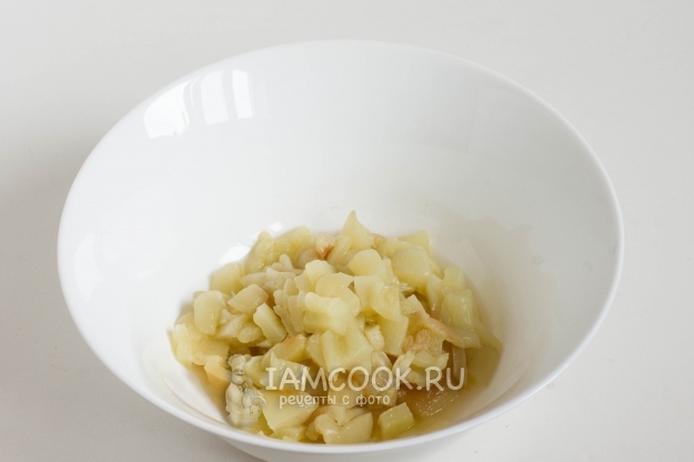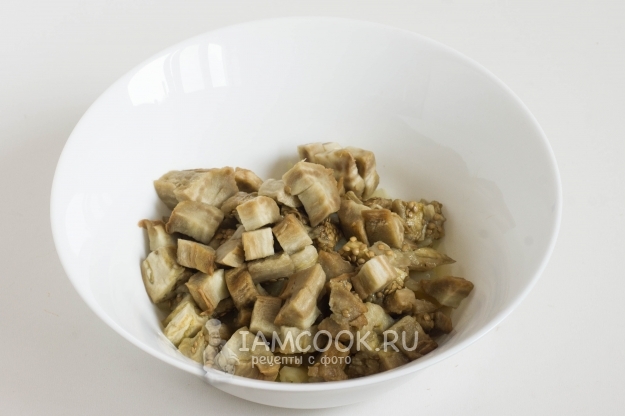 Запеченный баклажан также нужно остудить, очистить от шкурки, не крупно нарезать и добавить в салат.