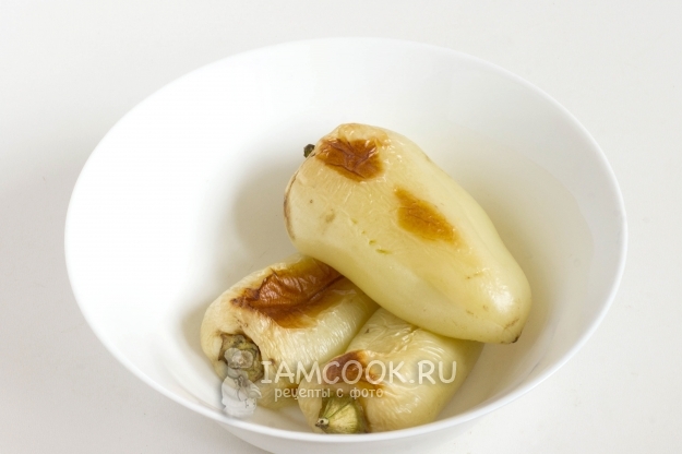 Остывшие перцы очистите от кожицы и от семян. Мякоть нарежьте небольшими ломтиками.