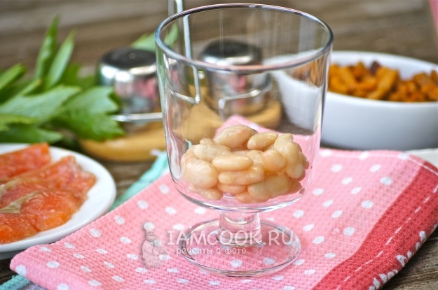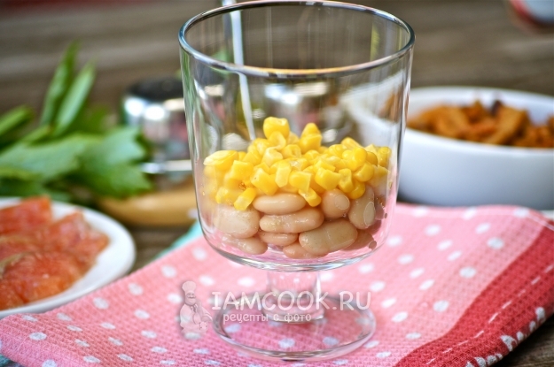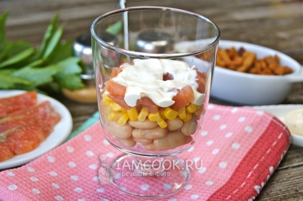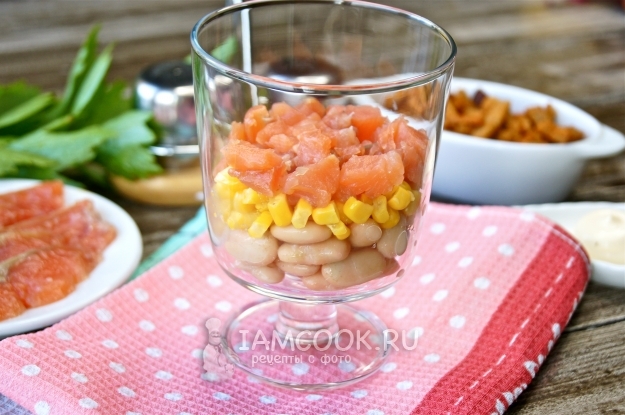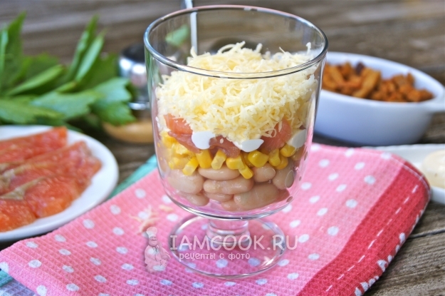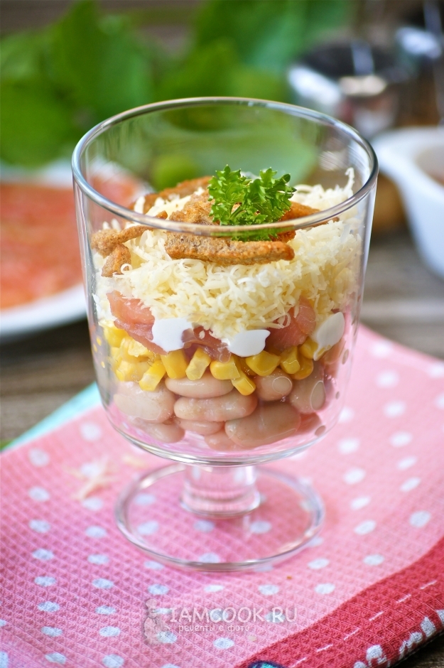 В оригинале салат делают в общем салатнике и перед подачей перемешивают, но я предпочитаю делать его порционно в креманках слоями, получается очень аппетитно и гостям нравится.