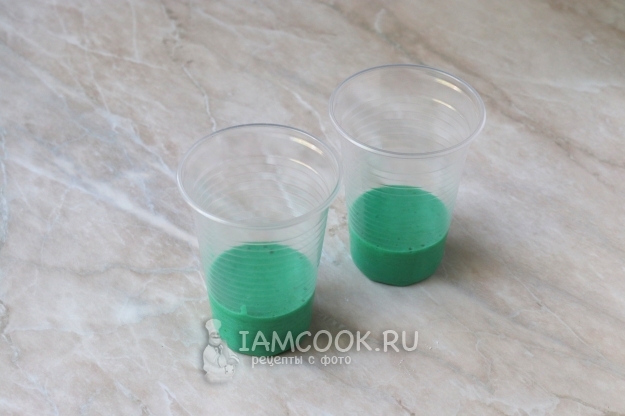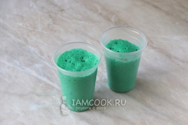 Перелить бисквитное тесто в пластиковые стаканы, заполняя их на 1/3. Отправить заготовку в микроволновую печь.