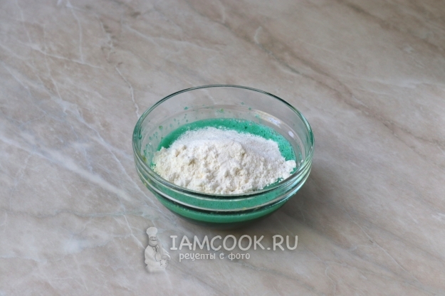После чего добавить просеянную пшеничную муку и разрыхлитель.