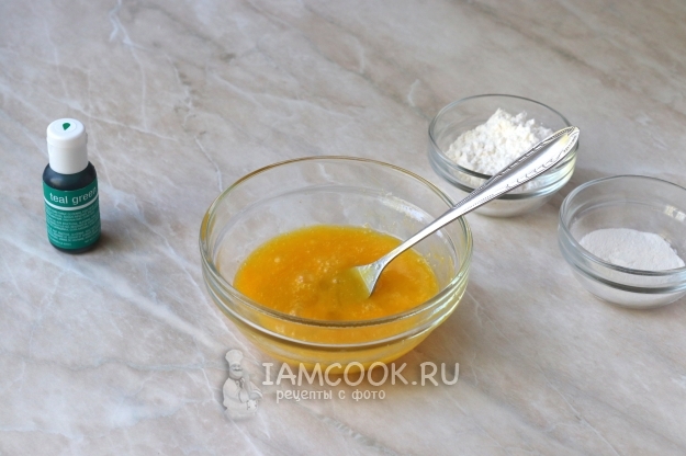 Добавить немного пищевого красителя (у меня - гелевый). От количества использованного красителя будет зависеть насыщенность готового бисквита.