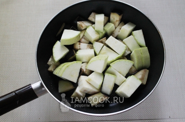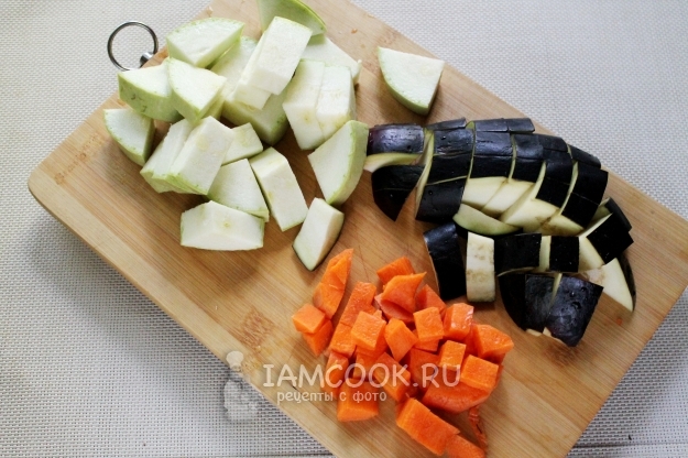 Порежьте крупным кубиком кабачок и баклажан. Чуть мельче нарезку используйте для моркови и лука.