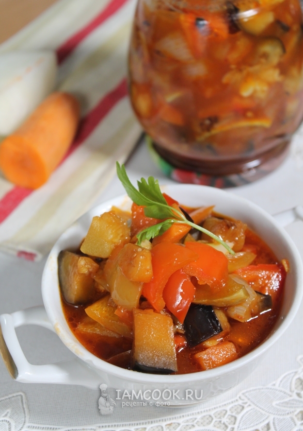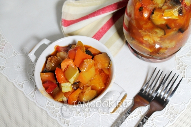 Соте из баклажанов и кабачков на зиму готово! Разложите его кипящим в стерильные банки и закройте прокипяченными крышками. Отправьте "под шубу" до полного остывания.