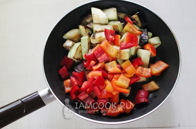 Все обжаренные овощи добавьте в сотейник к луку с морковью.