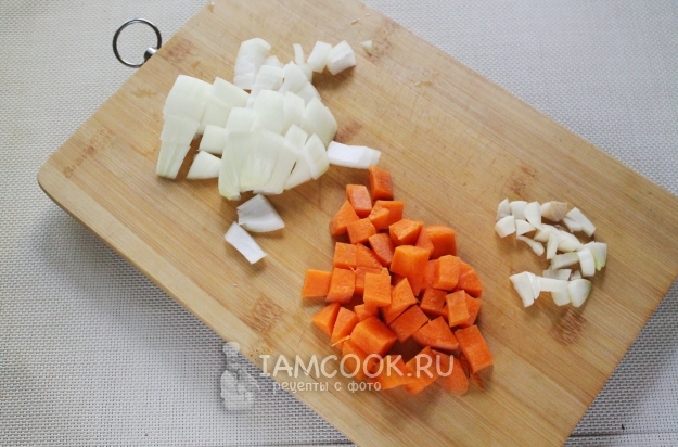 Для вкусовых дополнений измельчите морковь, лук и чеснок.