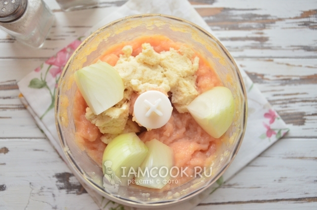 Хлебный мякиш отожмите и отправьте в чашу блендера. Репчатый лук разрежьте на 3-4 части и переложите сюда же. Измельчайте еще пару минут.