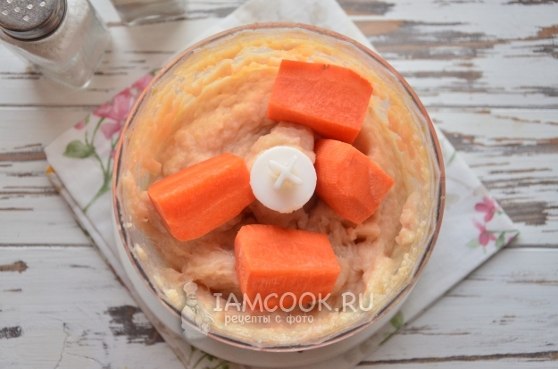 Теперь отправьте в чашу морковь, разрезанную на 3-4 части. Измельчайте еще несколько минут - пока фарш не станет полностью однородным.