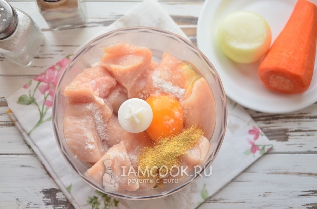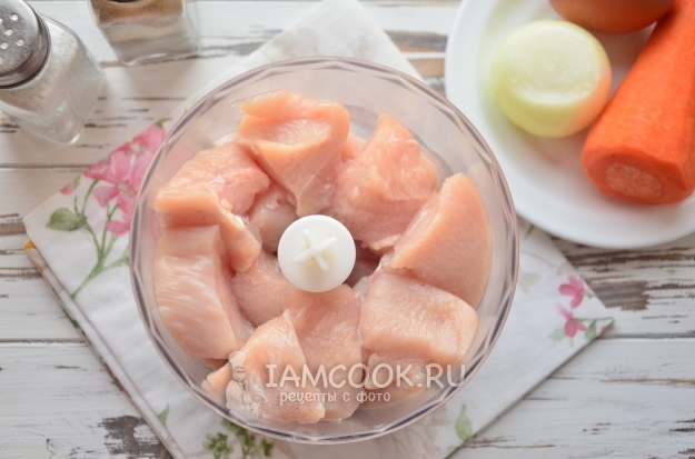 Куриное филе нарежьте небольшими кусочками и отправьте в чашу блендера. Также можно использовать мясорубку с мелкой решеткой.