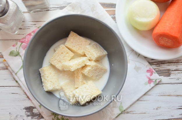 Обрежьте корочки у пшеничного хлеба, разрежьте мякиш на небольшие квадратики и отправьте в миску. Залейте молоком и оставьте на 10 минут.