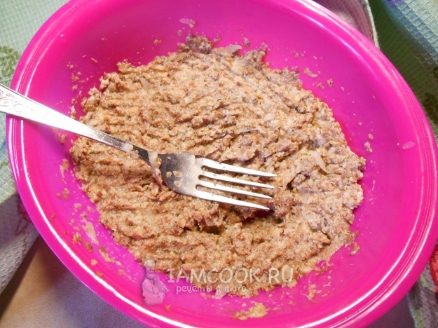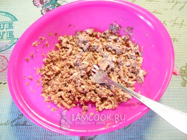 Откроем банку с консервированной рыбой, жидкость сольём. В подходящей посуде измельчим содержимое вилкой, как на фото. Косточки, если мягкие, я не выбираю, это хороший источник кальция для организма, нужно только хорошенько их размять.