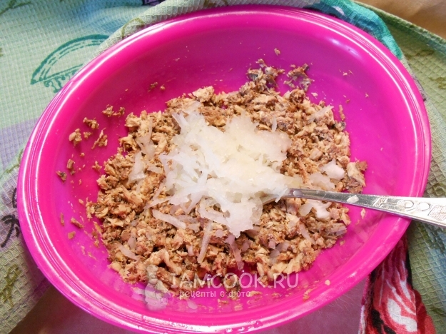 Подготовка не занимает много времени. Нужно почистить лук и открыть банку с консервами, а также подготовить яйцо.