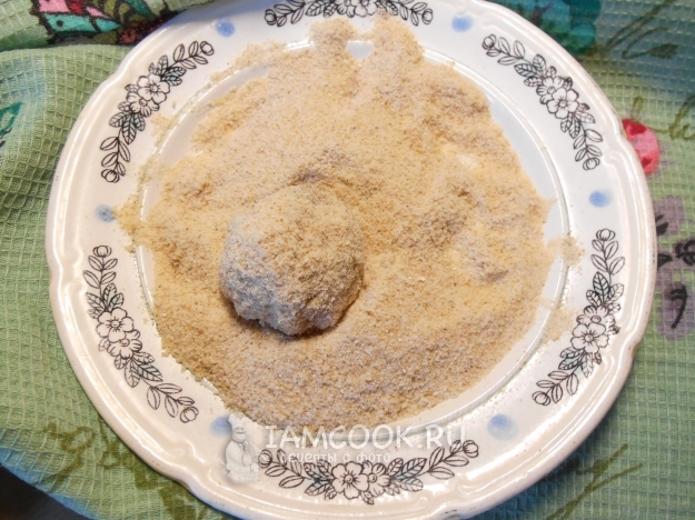 Приступаем к панировке. Насыпаем отмеренное количество панировочных сухарей в тарелку. Формируем шарик из фарша и хорошенько обсыпаем его сухарями со всех сторон.