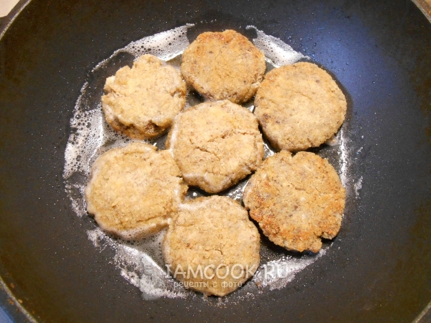 Сформируем котлетки, выложим на сковороду, обжарим с одной стороны. Когда перевернём на другую, огонь нужно уменьшить до минимума и накрыть сковородку крышкой. Можно добавить на донышко немного воды.