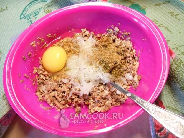 Далее нужно вмешать яйцо и добавить специи. Кроме зелени, рекомендую добавить молотый кориандр, он очень хорошо подходит к рыбным блюдам. Соли я добавляю совсем немного, на кончике ножа. Хорошо размешаем массу.