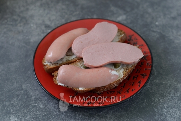 Сардельки очистите от оболочки. Если они небольшого размера, тогда разрежьте их вдоль пополам, в противном случае нарежьте тонкими ломтями и выложите на хлеб.