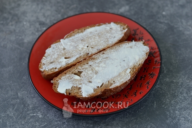 Ржаную булку разрежьте вдоль пополам. Мякиш смажьте слегка майонезом любимого производителя.