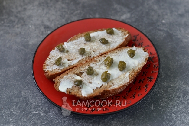 Очень вкусно в эти бутеры добавить что-то кислое. Мои домашние соленья этого года еще не дошли до кондиции, а немного каперсов всегда стоит в холодильнике. На слой майонеза положите каперсы или нарезанный тонкими ломтиками соленый огурец.