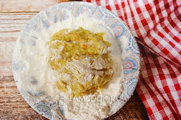Сформуем котлетки. Ложку-две массы выложим в муку и начнем скатывать круглые или овальные котлетки. Сначала обваляем в муке, затем смажем руки подсолнечным маслом и придадим котлетам форму в руках.