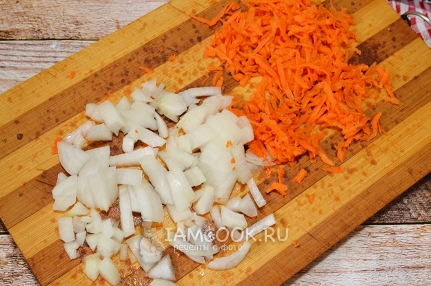 А тем временем нашинкуем лук и натрем морковку для пассеровки.