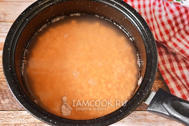 Воду, в которой чечевица замачивалась, сольем, зальем свежей водой, посолим и поставим на огонь.