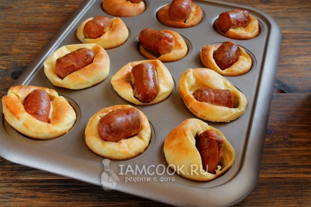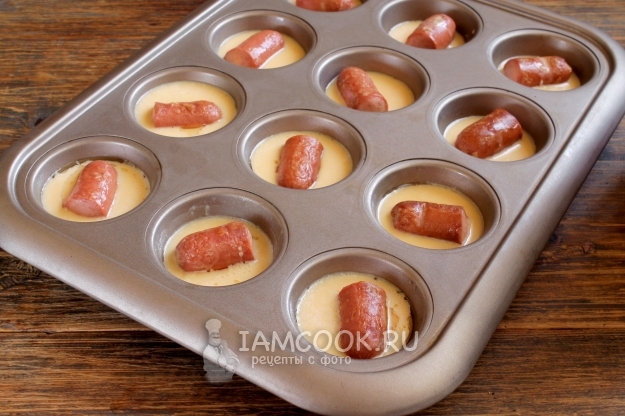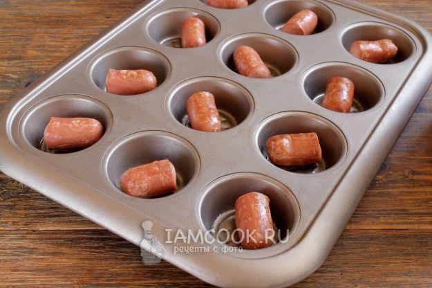 Поэтому смазываем формы постным маслом, укладываем сосиски и ставим в раскаленную духовку на 3-5 минут. Слегка обжариваем сосиски (раз переворачиваем) при температуре 190 градусов и заодно нагреваем емкости для теста.