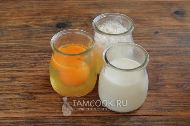 В качестве меры продуктов для замеса теста советую выбирать объем. Например, в сосуды одного размера вбиваем яйца и, ориентируясь на заданный уровень, вливаем молоко и всыпаем муку в две другие.
